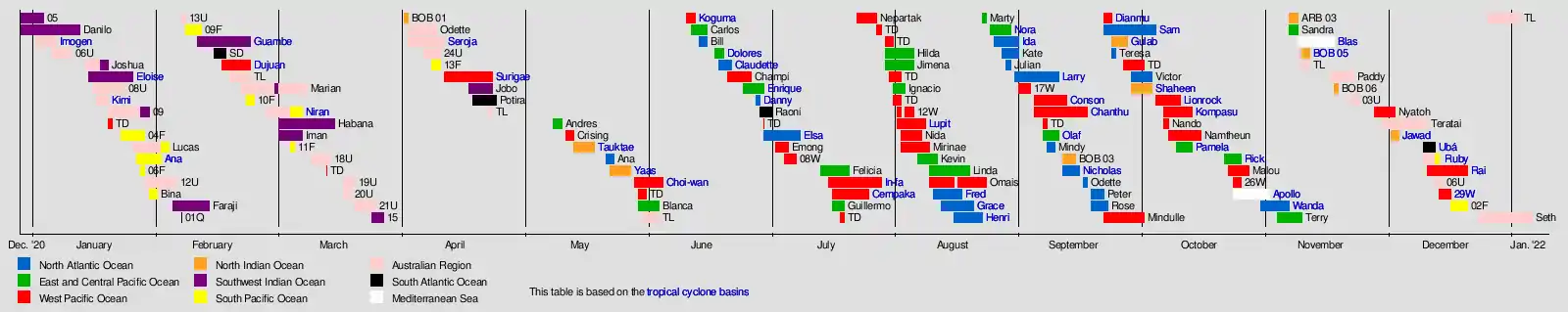 December was slightly inactive, featuring nine storms, with five of them being named. The month started off with the formation of Cyclone Jawad which formed in the North Indian Ocean. However, Jawad rapidly weakened due to wind shear shortly after being named, and degenerated into a low-pressure area before it could make landfall over West Bengal. The Western Pacific featured a tropical depression classified as 29W and a deadly and destructive typhoon, Typhoon Rai. Rai formed east of Palau before rapidly intensifying into a Category 5 super typhoon. It then made multiple landfalls on the Philippines causing serious damage. Rai then entered the South China Sea, re-strengthening into a Category 5 super typhoon east of Vietnam before dissipating near Hong Kong. Rai became the first Category 5 super typhoon since Nock-ten to form in the month on December. It was also the third Category 5 super typhoon recorded in the South China Sea, behind Pamela in 1954 and Rammasun in 2014. On the other hand, 29W formed near the equator before making landfall on Peninsular Malaysia, flooding some states within Malaysia. The Southern Hemisphere was inactive, only featuring three tropical lows and two cyclones named Ruby and Seth. Ruby intensified into a Category 2 tropical cyclone on the Australian scale and entered the South Pacific basin, making it the first storm in the basin. Ruby then made landfall on the French overseas island of New Caledonia. Seth, on the other hand, first originated in the Arafura Sea. It then wandered around the northern regions of Australia before being named in the Solomon Sea. The Southern Atlantic featured its third named storm of the year, Subtropical Storm Ubá.