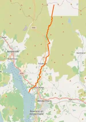 The river passes under Ing Bridge as it continues in a southerly direction down the Troutbeck valley through the tranquil fields of the valley bottom. The hamlets of Town Head and High Green are just to the west of the river as it enters Limefitt Park. On emerging from Limefitt the river is bridged by the A592 Kirkstone Pass road. Troutbeck village lies on the west side of the valley. Continuing through a narrow area of mixed woodland the river eventually reaches the A591 road at Troutbeck Bridge near the town of Windermere. After less than a mile (2 km) the river enters Windermere on its eastern shore at a point close to Calgarth Hall.