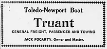 On the Fourth of July, 1910, Truant was scheduled to make extra excursion runs from Toledo to Newport, to leave Toledo at 7 a.m., 12:30 p.m., and 7:30 p.m., and departing Newport for Toledo at 10 a.m., 6 p.m., and immediately after the dance at night.[18] The round trip fare was 75 cents, 25 cents more than the usual Sunday excursion fare to Newport on Truant.[18]