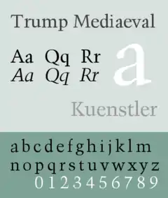 Trump Mediaeval (also German Trump MediƤval) is an old-style serif typeface designed by Georg Trump. It was released in 1954 both by the C. E. Weber foundry as metal type and Linotype for hot metal typesetting. [1] Despite a common association with blackletter typefaces, the mediaeval name refers to the German typographical term for roman typefaces dark in color like the old style Venetian typefaces. [2]