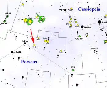 Trumpler 2 is an open cluster located in the constellation Perseus. It is approximately 2000 light-years from Earth, placing its position within the Perseus Arm of the Milky Way Galaxy. Although at this large distance, it can be seen with the naked eye, at magnitude 6.[1]