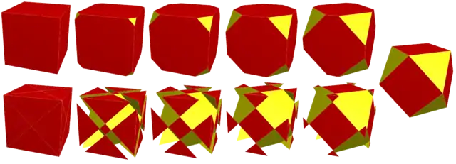 If the self-intersected portions of the octagrams are removed, leaving squares, and truncating the triangles into hexagons, truncated octahedra are produced, and the sequence ends with the central squares being reduced to a point, and creating an octahedron.