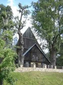 The village has a population of 2,044 in 2008. It has a wooden Baroque church.