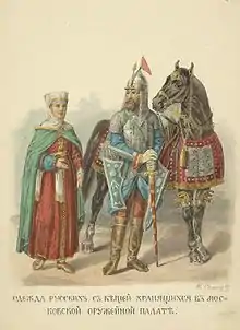 While the oldest endonyms of the Grand Duchy of Moscow used in its documents were "Rus'" (Русь) and the "Russian land" (Русская земля, Russkaya zemlya),[11] a new form of its name, Rusia or Russia, appeared and became common in the 15th century.[12][13][14] In the 1480s Russian state scribes Ivan Cherny and Mikhail Medovartsev mention Russia under the name Росиа, Rosia, and Medovartsev also mentions the sceptre "of Russian lordship" (Росийскаго господства, Rosiyskago gospodstva).[15] In the following century Russia co-existed with the old name Rus' and appeared in an inscription on the western portal of the Transfiguration Cathedral of the Spaso-Preobrazhensky Monastery in Yaroslavl (1515), on the icon case of the Theotokos of Vladimir (1514), in the work by Maximus the Greek,[16] the Russian Chronograph written by Dosifei Toporkov (?–1543/44[17]) in 1516–22 and in other sources.[18]