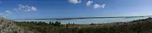 The lake is in a shallow basin and the area covered by water shrinks dramatically in the dry season, resulting in extensive exposed hypersaline flats. Glasswort (Salicornia pachystachya or Arthrocnemum pachystachyum) and other salt-tolerant plant species such as the golden leather fern (Acrostichum aureum) move onto the flats as the water levels recede. The introduced species beach sheoak (Casuarina equisetifolia) can be found in small stands along the east shore[17] as well as a narrow band of Salvadora angustifolia trees.[18]