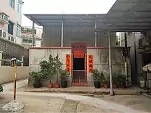 The only surviving portion of the original green-brick boundary wall at the main entrance of the Wai gives visitors an insight into the walled village's historical outlook.[1] Tin Hau, Kwan Tai and a Qing official are worshipped in the village shrine.[6]