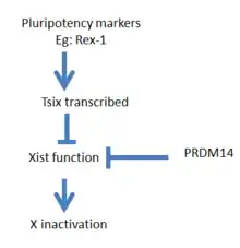 The marker Rex1, as well as other members of the pluripotency network, are recruited to the Tsix promoter and transcription elongation of Tsix occurs. Along with Tsix and other proteins, factor PRDM14 has been shown to be necessary for the return to pluripotency. Assisted by Tsix, PRDM14 can associate with Xist and remove the inactivation of an X chromosome.[11]