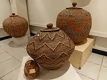 Batswana are noted for their skill at crafting baskets from Mokola Palm and local dyes. The baskets are generally woven into three types: large, lidded baskets used for storage, large, open baskets for carrying objects on the head or for winnowing threshed grain, and smaller plates for winnowing pounded grain. Potters made clay pots for storing water, traditional beer and also for cooking and hardly for commercial use. Craft makers made wooden crafts and they made traditional cooking utensils such as leso and lehetlho, traditional wooden chairs and drums among others.[22]