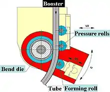 The process of tube bending involves using mechanical force to push stock material pipe or tubing against a die, forcing the pipe or tube to conform to the shape of the die. Often, stock tubing is held firmly in place while the end is rotated and rolled around the die. Other forms of processing including pushing stock through rollers that bend it into a simple curve.[2] For some tube bending processing, a mandrel is placed inside the tube to prevent collapsing. The tube is held in tension by a wiper die to prevent any creasing during stress. A wiper die is usually made of a softer alloy such as aluminum or brass to avoid scratching or damaging the material being bent.