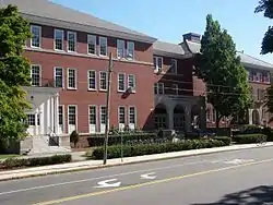 The "Uphill" portion can be accessed with the memorial stairs. Designed by the Olmsted Brothers in the 1920s, the memorial stairs form one of the main entrances to the university and allows direct access to the engineering school from the academic quad. The engineering school is part of the Tufts's "Downhill" portion of campus. Notable buildings around the engineering school include Bromfield-Pearson Hall (1893), Robinson Hall (1899), and Curtis Hall (1894). Boston architect George Albert Clough is responsible for the design of Curtis Hall and Goddard Hall. Additionally, Arland Dirlam is responsible for the designs of many buildings downhill. These include Cohen Auditorium (1950), Hodgdon Hall (1954), and Jackson Gymnasium (1947).[63] Other notable buildings downhill include the Mayer Campus Center and the Dewick Macphie Dining Hall.[64] Administrative offices also occupy the surrounding neighborhoods and nearby Davis Square, where Tufts makes payments in lieu of taxes on some of its tax-exempt (educational) properties.[65]