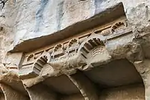 Over the front of one of the cells to the north-east of this are left some Chaitya-window ornamentation, a larger one over where the door has been, the inner arch of which is filled with knotted ribbons etc..., similar to what is over the Chaitya-cave door at the Nasik Caves, while the front of the arch is carved with flowers. On each side of this is a smaller arch; and farther to the left is a dagoba in half relief with the umbrella or chhatri over it, on each side a Gandharva or Kinnara above, and a male figure below, that to the right attended by a female, but all of them weatherworn. Over all is a projecting frieze carved on front with the "Buddhist rail pattern".[3]