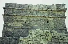 Tulum has architecture typical of Maya sites on the east coast of the Yucatán Peninsula. This architecture is recognized by a step running around the base of the building which sits on a low substructure. Doorways of this type are usually narrow with columns used as support if the building is big enough. As the walls flare out there are usually two sets of molding near the top. The room usually contains one or two small windows with an altar at the back wall, roofed by either a beam-and-rubble ceiling or being vaulted.[7] This type of architecture resembles what can be found in the nearby Chichen Itza, just on a much smaller scale.[3]
