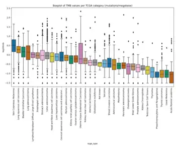 There is a large variation in TMB values across different cancer types as the number of somatic mutations can span from 0.01 to 400 mutations per megabase of genome.[1][8][9] It has been shown that melanoma, NSCLC and other squamous carcinomas have the highest levels of TMB in this order, while leukemias and pediatric tumors have the lowest levels of TMB and other cancers like breast, kidney, and ovary have intermediate TMB values.[8] There is also variation in TMB across different subtypes of different cancers.[8] Due to high variability in TMB across different cancer types and subtypes, it is important to define different cut-offs to have an improved survival prediction and a better treatment decision.[1][8][9] For example, Fernandez et al. showed that TMB can range from 0.03 to 14.13 mutations per megabase (mean=1.23) in TCGA prostate cancer cohort while this range is from 0.04-99.68 mutations per megabase (mean=6.92) in TCGA bladder cancer cohort.[12] A recent study illustrated that different cut-offs are needed for different cancer types to find the patients who can benefit from ICI therapy.[1] In addition, it is crucial to understand that usually there are different clusters of cells in a tumor, known as tumor heterogeneity, that can affect TMB and consequently the response to ICIs.[8] Another factor that can affect TMB is whether the source of the sample is primary or metastatic tissue.[13] Most metastatic samples have been shown to be monoclonal (i.e. there is only one cluster of cells in the tumor), while primary tumors usually consist of a higher number of clusters and have higher overall genetic diversity (more heterogeneous).[13] Scientists have shown that metastatic tumors usually have a higher TMB level compared to primary tumors and this can be due to monoclonal nature of metastatic lesions.[13]