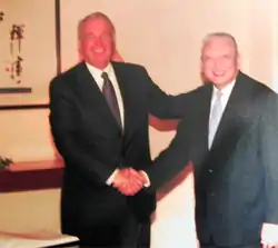 He joined his father's business upon his return to Hong Kong in 1969 and gradually took over the leadership of the family enterprise. He took over his family business in 1982 when his father died. However, in 1985, his company was heavily in debt and teetered on the edge of bankruptcy. Henry Fok, a pro-Beijing businessman took initiative and helped Tung's family, with the support of the Beijing government. At the time of the Sino-British negotiation over Hong Kong's sovereignty, Beijing was enforcing the "united front" strategy to gather the widest possible range of allies together and gradually isolate opponents. Tung became close to the Communist authorities in Beijing afterward especially with Jiang Zemin, former General Secretary of the Chinese Communist Party, who had risen to power surrounded by his "Shanghai clique"; Tung could be associated with them because he was from the nearby city of Ningbo, Zhejiang and had lived and worked in Shanghai for a while.[16] Tung was a member of the Basic Law Consultative Committee from 1985 to 1990, responsible for the drafting of the Basic Law of Hong Kong. In 1993, he was appointed to the Chinese People's Political Consultative Conference, the top advisory body of China.[14] He also established close relationship with US President George H. W. Bush and US Assistant Secretary of State Winston Lord.