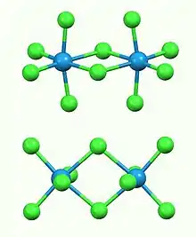 The compound exists as a dimer, with a pair of octahedral tungsten(V) centres bridged by two chloride ligands. The W---W separation is 3.814 Å, which is non-bonding. The compound is isostructural with Nb2Cl10 and Mo2Cl10. The compound evaporates to give trigonal bipyramidal WCl5 monomers.[3]
