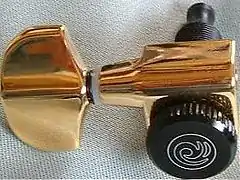 Fine tuners are not geared. They have a screw with a knurled head, whose lower end advances against one end of a lever with a right-angle bend in it. The string is fastened to the other end of the lever, and tightening the screw tightens the string.[8] With the screw at the lower limit of its travel, the lever can come close enough to the instrument's top to pose a risk of scarring it.[9] To avoid damage to the top, the screw may be turned out as far as it goes while still engaging the lever, and the string re-tuned using the peg.[10]