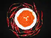 Unlike other North African cuisines, Tunisian food is quite spicy. A popular condiment and ingredient which is used extensively in Tunisian cooking, harissa, is a mix of ground chili peppers, garlic, and spices commonly sold together as a paste. It is usually the most important ingredient in different sauces and gravies. Westernised harissa mostly contains red chilies to replace black cumin which is different from standard cumin. Other common spices include cumin or cumin seeds, garlic, caraway seeds, coriander seeds and paprika. A recipe for the sauce includes red chili peppers and garlic, flavored with coriander, cumin, olive oil and often tomatoes.