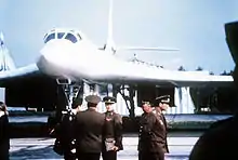 The first competition for a supersonic strategic heavy bomber was launched in the Soviet Union in 1967. In 1972, the Soviet Union launched a new multi-mission bomber competition to create a new supersonic, variable-geometry ("swing-wing") heavy bomber with a maximum speed of Mach 2.3, in response to the US Air Force B-1 bomber project. The Tupolev design, named Aircraft 160M, with a lengthened blended wing layout and incorporating some elements of the Tu-144, competed against the Myasishchev M-18 and the Sukhoi T-4 designs.[9] Work on the new Soviet bomber continued despite an end to the B-1A and in the same year, the design was accepted by the government committee. The prototype was photographed by an airline passenger at a Zhukovsky Airfield in November 1981, about a month before the aircraft's first flight on 18 December 1981. Production was authorized in 1984, beginning at the Kazan Aircraft Production Association (KAPO).[10]
