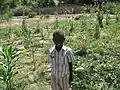 Child standing in household garden.