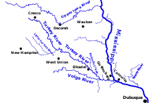 The Turkey River is a 153-mile-long (246 km)[3] tributary of the upper Mississippi River. Its main branch rises in Howard County, Iowa, near the city of Cresco. The other counties it or its tributaries cover are Chickasaw, Winneshiek, Fayette, Clayton, Delaware, and Dubuque. Tributaries include the Little Turkey River and Crane Creek.