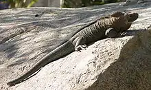 The Turks and Caicos rock iguana (Cyclura carinata) is a species of lizard endemic to the Turks and Caicos islands. This small iguana can reach 30 in (76 cm) and becomes mature at seven years and may live for twenty. A single clutch of up to nine eggs is laid each year, and these take three months to hatch. This iguana is mostly herbivorous, but supplements this by adding some animal matter to its diet.