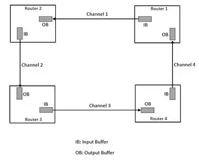 A deadlock (shown in fig 1) is a situation in which no further transportation of packets can take place due to the saturation of network resources like buffers or links. The main reason for a deadlock[3] is the cyclic acquisition of channels in the network.[4] For example, consider there are four channels in a network. Four packets have filled up the input buffers of these four channels and needs to be forwarded to the next channel. Now assume that the output buffers of all these channels are also filled with packets that need to be transmitted to the next channel. If these four channels form a cycle, it is impossible to transmit packets any further because the output buffers and input buffers of all channels are already full. This is known as cyclic acquisition of channels and this results in a deadlock.