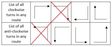 A turn restriction routing can be obtained by prohibiting at least one of the four possible clockwise turns and at least one of the four possible anti-clockwise turns in the routing algorithm. This means there are at least 16 (4x4)[5] possible turn restriction routing techniques as you have 4 clockwise turns and 4 anti-clockwise turns to choose from. Some of these techniques have been listed below.
