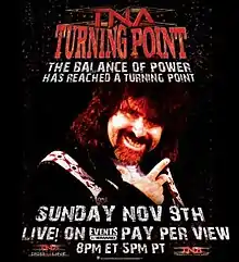 Heading into Turning Point, TNA's main storyline was an on-screen rivalry between professional wrestling veterans, who played the villains and called themselves The Main Event Mafia (Sting, Kurt Angle, Kevin Nash, Booker T, and Scott Steiner), and the younger talent of the company, who played the heroic characters and were led by A.J. Styles and Samoa Joe. Multiple smaller rivalries broke off from this storyline, such as one over the TNA World Heavyweight Championship between the reigning champion, Sting, and the challenger, Styles. It began on August 10 at TNA's Hard Justice PPV event when Sting assaulted Styles after his encounter with Angle.[10] Sting then defeated Joe, an ally of Styles, at TNA's Bound for Glory IV PPV event on October 12 after an assist from Nash, which later sparked a rivalry between Joe and Nash.[11] Sting's and Styles' rivalry soon escalated to a point where storyline co-owner of TNA Mick Foley announced on the October 30 episode of TNA's television program TNA Impact! that the two would fight for the championship at Turning Point.[12]