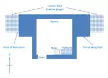 On the stone wall, (in the same way as Milecastles,) additional structures known as Wing Walls were incorporated on the east and west side, allowing bonding to the curtain wall. This is interpreted as evidence that turrets (and milecastles) were constructed before the curtain wall. Where turrets were built with the intention of bonding to a broad gauge curtain wall, they were given broad wing walls. However, there are many cases where the curtain wall actually constructed was of narrow gauge, giving a point of reduction where the curtain wall and turret wing walls join. To facilitate bonding with the curtain wall, wing walls were constructed longer at the base, and stepping inwards as they were built upwards. Turrets thought to have been constructed later in the plan were built with much shorter wing walls.[14]
