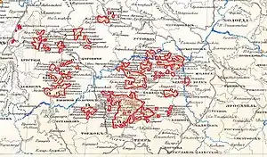 Refugees from the Korelsky uyezd of the Vodskaya pyatina settled on the palace (state) lands of the Bezhetsk upper and other parts of the Bezhetskaya pyatina, which were deserted due to the turmoil and oppression of the Time of Troubles; historically, these territories made up Tver Karelia. By the beginning of the 20th century, the largest number of Tver Karelians lived in Bezhetsky, Vesyegonsky, Vyshnevolotsky, Novotorzhsky, partly in Tversky, Zubtsovsky, Kashinsky uyezds.[1] According to the 1926 census, the Tver Karelians numbered 140,567 people, of which more than 95% spoke the Karelian language.