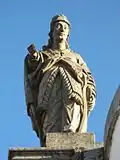 Baruch holds forth a parchment whose quotations are a synthesis of several passages of his book. The sculpture, located on the pedestal that finishes off the wall alignment of the central courtyard, is a young and beardless figure, clad in short tunic, cloak, and boots. He wears a turban decorated with a brim similar to that of the prophet Jeremiah. With one hand he holds the folds of his mantle, while in the other he bears the parchment.[9] The piece, with its squat proportions and anatomical errors evident, is one of the weakest of the set. As with the other figures, however, the strength of the image comes from the expression on his face.