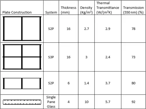 Twinwall Polycarbonate exhibits high degree of durability and toughness. Although single layer polycarbonate sheeting is more flexible than polycarbonate in twinwall configuration, it still retains significant advantages over alternative materials, including glass. A typical 6mm sheet has a density of 0.72 g/cm^2[6] and a thermal insulation R value of 0.3 m^2°C/W, while allowing 80% of visible light pass through.[7] These attributes, coupled with a service temperature range in excess of 120 °C (-51 °C to 71 °C), makes polycarbonate the ideal material for twinwall application.
