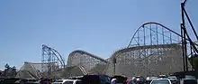 For its next attraction to debut in 1978, Magic Mountain wanted a wooden roller coaster for the classic "rumble and sway" experience that they felt was missing from steel coasters.[2] They hired Ohio-based International Amusement Devices (IAD), who began designing Colossus in January 1977.[3][4][5] IAD in turn subcontracted Bernard Brothers Construction for the construction of the ride, Continental Consultants for all of the mechanical systems, and Lorenz & Williams for the structural engineering and electronic systems.[2][3] A member of the design team traveled to Mexico City to study Montaña Rusa – the largest wooden roller coaster in the world at the time – in order to help plan for the project.[2][3]