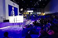 On February 10, 2014, Twitch's parent company (Justin.tv, Inc.) was renamed Twitch Interactive, reflecting the increased prominence of the service over Justin.tv as the company's main business.[31] That same month, a stream known as Twitch Plays Pokémon, a crowdsourced attempt to play Pokémon Red using a system translating chat commands into game controls, went viral. By February 17, the channel reached over 6.5 million total views and averaged concurrent viewership between 60 and 70 thousand viewers with at least 10% participating. Vice President of Marketing Matthew DiPietro praised the stream as "one more example of how video games have become a platform for entertainment and creativity that extends WAY beyond the original intent of the game creator. By merging a video game, live video and a participatory experience, the broadcaster has created an entertainment hybrid custom made for the Twitch community. This is a wonderful proof of concept that we hope to see more of in the future."[32][33] Beginning with its 2014 edition, Twitch was made the official live streaming platform of the Electronic Entertainment Expo.[34]