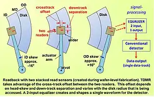 The TDMR approach arose from a working group set up under INSIC to explore alternative future storage technologies.[5] In the initial concept, the data-tracks were assumed to be very narrow tracks created by shingled recording and subject to considerable mutual interference. The read-heads were assumed to be each centered over a corresponding data-track and a joint detector would optimally recover data from several tracks simultaneously.[6][7] The technique was viewed as akin to PRML in providing gains similar to and in addition to the gains from PRML but operating across the tracks rather than down the track. A relatively large body of subsequent work has explored this configuration primarily from the perspective of signal processing.[8][9][10][11][12] However, the technical challenge of creating an array of closely spaced read-heads and the complexity of jointly detecting data simultaneously on several tracks are both considerable.