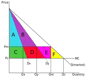 A solution to pricing consumer X out of the market is to instead charge a lump-sum fee equal to area AC, and continue to charge Pc per unit. Profit in this instance equals twice the area AC (two consumers): 2 x AC. As it turns out, since consumer Y's demand is twice consumer X's, ABCD = 2 x AC. The profit is the same and the producer is indifferent to either of these pricing possibilities, although consumer Y is better off this way since she gets consumer surplus BD.