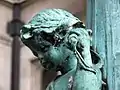 One enters the building through some fine iron gates that lead onto a paved forecourt and lawn with an arcaded boundary wall on one side and on the other a portico designed by Frith.[5] Balustraded stone steps lead up to the main door, these steps being flanked on either side by two magnificent bronze lamp standards featuring the figures of two small mischievous-looking boys.[5] These cherubs by Frith, with one conversing through a telephone, celebrate the then new age of telecommunication and electricity.[20]