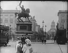 A young boy and his sister see a motor-car ready to depart in front of their house. They hook their little cart to the back of it, step in and drive along until they reach the Place Royale (English: Royal Square), with the statue of Godfrey of Bouillon in its center and the Palais de Justice (English: Law Courts of Brussels) in the background. From there, they walk on to visit the Grand Place and watch the Manneken Pis being dressed.
