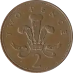 The British decimal two pence coin (often shortened to 2p in writing and speech) is a unit of currency equalling 2/100ths of a pound sterling. Since the coin's introduction on 15 February 1971, the year British currency was decimalised, its obverse has featured four profiles of Queen Elizabeth II.[1] In 2008 the design on its reverse changed from the original depiction of a plume ostrich feathers with a coronet to a segment of the Royal Shield.