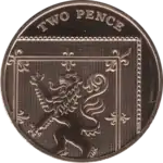 In August 2005 the Royal Mint launched a competition to find new reverse designs for all circulating coins apart from the £2 coin.[9] The winner, announced in April 2008, was Matthew Dent, whose designs were gradually introduced into the circulating British coinage from mid-2008.[10] The designs for the 1p, 2p, 5p, 10p, 20p and 50p coins depict sections of the Royal Shield that form the whole shield when placed together. The shield in its entirety was featured on the now-obsolete round £1 coin. The redesigned 2p coin depicts the second quarter of the shield, showing the Lion Rampant from the Royal Banner of Scotland, with the words TWO PENCE above.