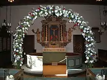 The small wooden chapel of St. Olof is situated on top of a stony hill among birches and pine-trees. Originally, the chapel was discovered by the antiquarian Erik Salvén in 1931, when he held a seminar on Greek art in Lidhult, a small community at the borders of the landscapes Halland and Småland. There he heard of a wooden church, with decorations and wooden details, built in 1721 and demolished in the late 19th century. The small church had been sold to a farmer in the village of Prosteköp and had been rebuilt into a residential house. As the farmer had been thinking of pulling down the old chapel because of its lack of amenities for the elderly couple that lived there, Salvén decided to move the church to Tylösand with the help of his good friend and priest Knut Peters. In 1950, the small chapel of St. Olof was erected.[3]
