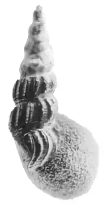 | An apertural view of the shell of Tylomelania centaurus from its type description (holotype, NMB 1339a from Natural History Museum of Basel).[1] The shell is partly covered by the sponge Pachydictyum globosum. | |