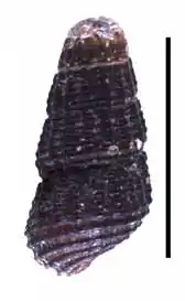 An abapertural view of a shell of a holotype of Tylomelania hannelorae.