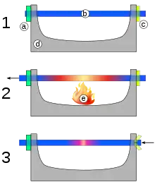 During the experiment the steel rod (b) is heated with a flame (e) up to red heat temperature. During the heating phase the thermal expansion of the rod (b) is compensated by tightly fastening the nut (a). Taking away the flame starts the cooling phase. Typically the bar (c) breaks within a few minutes with a loud bang or it is at least deformed significantly.