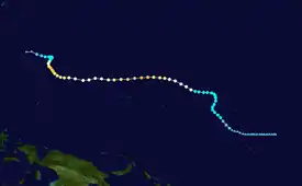 The trough's influence soon abated, allowing a nearby ridge of high pressure to restrengthen and induce a westerly bearing to Alice's motion that would continue for five days.[1] Alice strengthened into a typhoon on January 6 and continued to intensify thereafter, reaching a peak intensity on January 8 with maximum sustained winds of 125 mph (205 km/h) and a minimum central pressure of 930 mbar (hPa; 27.46 inHg).[4] Concurrently, the typhoon accelerated to a forward speed of 16 mph (26 km/h) and began to weaken. An area of wind shear southeast of Guam, described by the JTWC as a "frontal shear-line", slowed Alice's movement on January 9. A region of cooler and drier air north of this region was entrained also into the storm, causing Alice to lose some organization and weaken further. Two days later, a second trough over eastern Asia resulted in Alice curving north.[1] During this trek, the typhoon restrengthened and reached a secondary peak intensity with winds of 115 mph (185 km/h) on January 11, with satellite imagery indicating robust outflow.[1][4] However, this second peak was short-lived as Alice's circulation began to vertically decouple in the face of strong wind shear, exacerbated by Alice's low-level circulation moving directly into the westerly wind flow aloft.[1] The typhoon degenerated into a tropical storm on January 13 and weakened further into a tropical depression 18 hours later; these remnants dissipated by January 15.[1][3]
