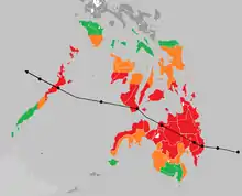 Initially, the National Disaster Risk Reduction and Management Council (NDRRMC) advised the citizens of Iligan and Cagayan de Oro to prepare for the impact of the storm, as they really did not want a repeat of Severe Tropical Storm Washi, which had hit when people were asleep and, therefore, had caused a large number of deaths. On December 2, the NDRRMC put parts of the central and southeastern Philippines on high alert. Relief food and medicines had been pre-positioned while thousands of people along the country's eastern border were being prepared for evacuation to safer ground in preparation for the typhoon.[41] With Bopha expected to strike Mindanao and Visayas, as well as areas in Southern Tagalog and Metro Manila, the possibility of landslides was advised in Surigao, Davao, Compostela Valley, Misamis, Bukidnon, Lanao del Norte, Lanao del Sur, Zamboanga, Leyte, Cebu, Bohol, Negros, Panay and Mindoro.[42] "Keep updated on the bulletins from PAGASA. Always cooperate with the local authorities as the National Government is all ready to provide all assistance to those that may be affected," Valte said.[43] Also, disaster authorities in Bicol were alerted and getting ready with their disaster contingency plan as the typhoon was closing in.On December 3, around 2,000 families living in Hinatuan, on the province of Surigao del Sur, were evacuated. Since schools would be turned into evacuation centers, Candelario Viola, the mayor of Hinatuan, ordered the suspension of all classes in the town.[44] Mar Roxas, the Interior and Local Government Secretary, said that National Disaster Risk Reduction and Management Council’s disaster monitoring systems were set up in several regions across the Philippines. "In accordance with President Aquino’s marching orders to ensure zero casualties from disasters, as much as possible, I have ordered our regional directors to make sure that the necessary precautions are undertaken to mitigate the effects of Tropical Storm Bopha," he said. "We have our existing protocols, and it is just a matter of implementing them and making other necessary preparations as appropriate." Roxas added.[45] As preparations continued, Storm signal number 1 was declared over Siquijor, Bohol, Biliran, Camotes Island, Cebu Southern Leyte, Leyte, Eastern Samar, Western Samar, Surigao del Norte, Siargao Island, Dinagat Island, Agusan del Norte, Agusan del Sur, rest of Davao Oriental, Davaol del Norte including Samal Island, Compostela Valley, Bukidnon, Misamis Occidental, Misamis oriental, Camiguin, Lanao del Norte and Lanao del Sur. Also, signal number 2 was raised over Surigao del Sur and the northern part of Davao Oriental.[46] The national police, coast guard (PCG) and navy had placed their personnel on standby and their disaster-response units in preparation for Bopha's impact. "We are ready to conduct rescue operations in flooded areas. Let us warn operators of small vessels, motor bancas, and fishing boats to avoid sailing in the southeastern and eastern section of the country where the sea is rough," said PCG spokesman Commander Armand Balilo.[47] After staying in the South China Sea for at least 4 days, "Pablo" again threatened the western sections of Northern Luzon, and by the afternoon of December 8, public storm warning signal number 2 was raised over 3 provinces, and 11 provinces were inside signal number 1.[48] Forecasters said the storm had turned and is due to hit the Philippines on December 9.[49]