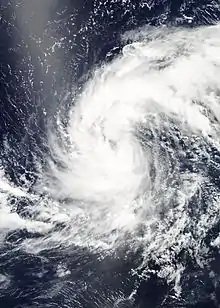 Coinciding with Chan-hom's abrupt collapse on July 3, the system turned northeast as it entered a weakness in the steering ridge.[16][18] Later that day, the broad circulation turned north-northwest.[20] Wind shear eased early on July 4 as the TUTT cell retreated to the north and the subtropical ridge steadily re-established itself. Convection started redeveloping over the tropical storm.[21] Late on July 4 into July 5, the center of Chan-hom skirted the southern coast of Rota in the Mariana Islands.[22][23] While near the island, Chan-hom executed an unusual counter-clockwise loop owing to interaction with a monsoon trough.[24][25] Once clear of the Mariana Islands, steady development ensued owing to low wind shear and good outflow.[26] Early on July 7, Chan-hom attained typhoon intensity according to the JMA,[7] following to a burst in central convection.[27][28] Microwave satellite imagery indicated the formation of an eye as convection deepened and banding features tightened around the circulation.[29]