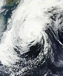 After maintaining its peak intensity for about 36 hours, Francisco began weakening,[3] after the eye lost definition due to building wind shear.[13] By October 21, the eye became ragged and cloud-filled while the overall satellite presentation of the storm became elongated.[14] That day, the typhoon entered the area of responsibility of the Philippine Atmospheric, Geophysical and Astronomical Services Administration (PAGASA), which gave Francisco the local name Urduja;[15] the agency would cease issuing advisories on October 23.[16] Conditions generally remained favorable, allowing the eye to remain distinct despite a great reduction in the sustained winds.[17] Dry air began affecting the tropical cyclone late on October 22, cutting off the flow of moist air, and water temperatures cooled along the storm's track.[18] As a result, the eye dissipated and the convection weakened.[19] An approaching trough from the Korean peninsula weakened the ridge to the north, slowing the typhoon and allowing it to turn north and northeast on October 24.[20] Francisco weakened below typhoon status after passing 210 km (130 mi) southeast of Okinawa.[3][21] The storm began interacting with the approaching cold front while it passed south of Japan, moving around the subtropical ridge. With increasing wind shear, the circulation became exposed from the convection,[22] and the JTWC discontinued advisories on October 25, declaring that Francisco was becoming extratropical.[23] On the next day, Francisco completed its extratropical transition, but dissipated later on October 26, to the southeast of Japan.[3]