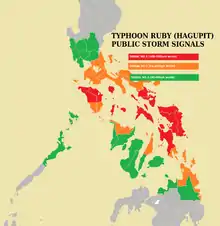 Typhoon Hagupit, also known as Typhoon Ruby, entered the PAR late on 3 December, at the same time it was upgraded into a Category 5 super typhoon. With this, the NDRRMC reported that schools were suspended in the areas: Samar, Biliran and Tacloban during 4–5 December.[43] On 5 December, the NDRRMC had put up Signal Warnings No. 1 and 2 from the lower part of Luzon to the upper part of Mindanao. Rough seas and gale-force winds were warned over the seaboards over the eastern part of the country.[44] The Department of Health went under Code Red alert at DOH-retained hospitals in regions expected to be hit by the typhoon starting on 6 December.[45] At the same time, PAGASA has put up Signal No. 3 warnings over Samar and were expecting storm surge up to 4 metres high.[46] Residents in at least 42 areas in Bicol and Visayas took precautionary measures against possible storm surge due to Ruby. As of 7:30 a.m, Project NOAH said three of the 42 are under Storm Surge Advisory (SSA) 3, 11 are under SSA 2, and the rest are under SSA 1. SSA 3 involves waves of up to four meters above sea level; SSA 2 three meters; and SSA 1 two meters.[47] It was also reported that schools and businesses were closed from 5–6 December in places in Visayas and southern Luzon.[48]