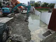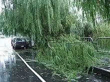 At least 19 lost their lives due to the storm and six were reported as missing.[15] Tainan County (now part of Tainan City) in southern Taiwan reported more than 1,100 millimetres (43 in) of rainfall in some mountain regions.[16] An estimated 600 millimetres (24 in) of rain fell within seven hours, causing several drainage systems to overflow.[17] Local media reported that an estimate 115,000 people in Taiwan, primarily in Tainan, Nantou County, and Taichung County (now part of Taichung City) lost power during the storm.[18] The storm caused NT$ 300 million (US$15.1 million) worth of damage,[19] and destroyed about 5,100 hectares of orchards and crops.[6] Agricultural losses amounted to $300 million (USD).[20]